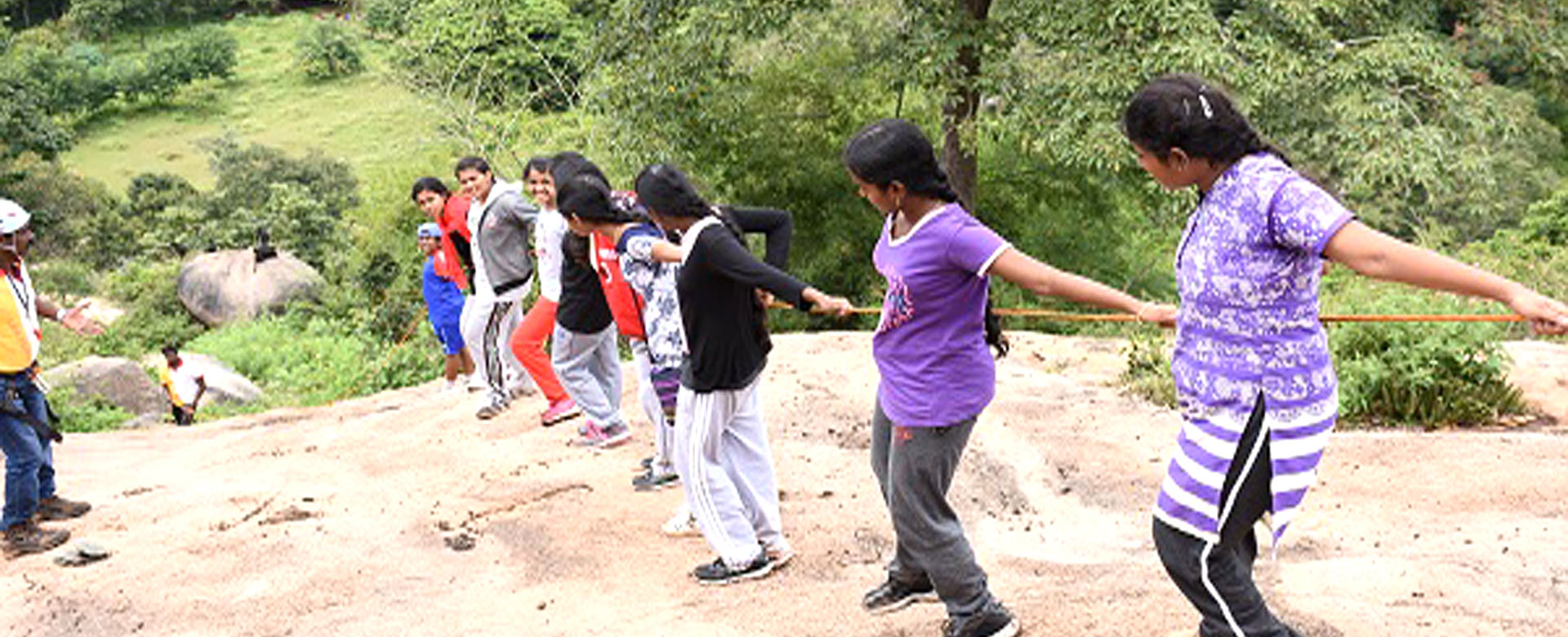 Recently 65 students and 12 teachers of Shri Natesan Vidyasala MHSS., Mannivakkam, including the well-known trekking and mountaineering trainer Mr. Thirulogachandran, were sponsored by the school for a three day trekking program to Yelegiri hills recently. This program was organised to motivate the students who had been performing well in academics, sports and extracurricular activities. The students were trained on trekking, bouldering, rope walking, rappelling, river crossing, rock climbing etc. Apart from this they were trained on the art of public speaking, study of flora and fauna, yoga and meditation and eco study.